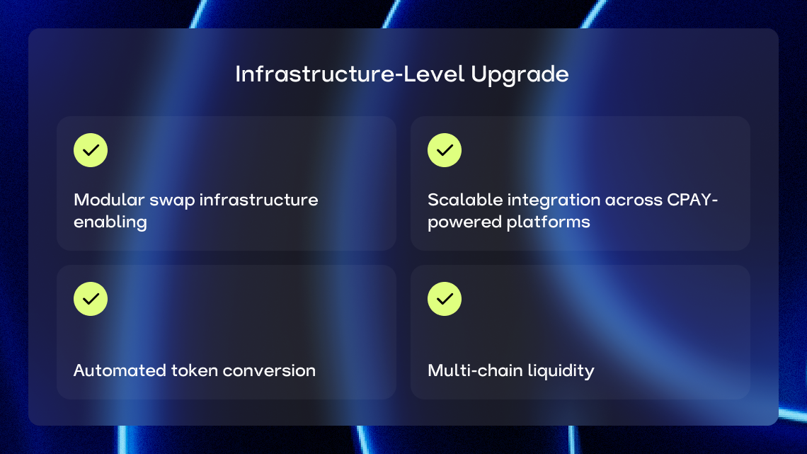 This integration strengthens CPAY’s infrastructure layer by allowing users and platform partners to exchange tokens across multiple blockchain networks without leaving the CPAY ecosystem.