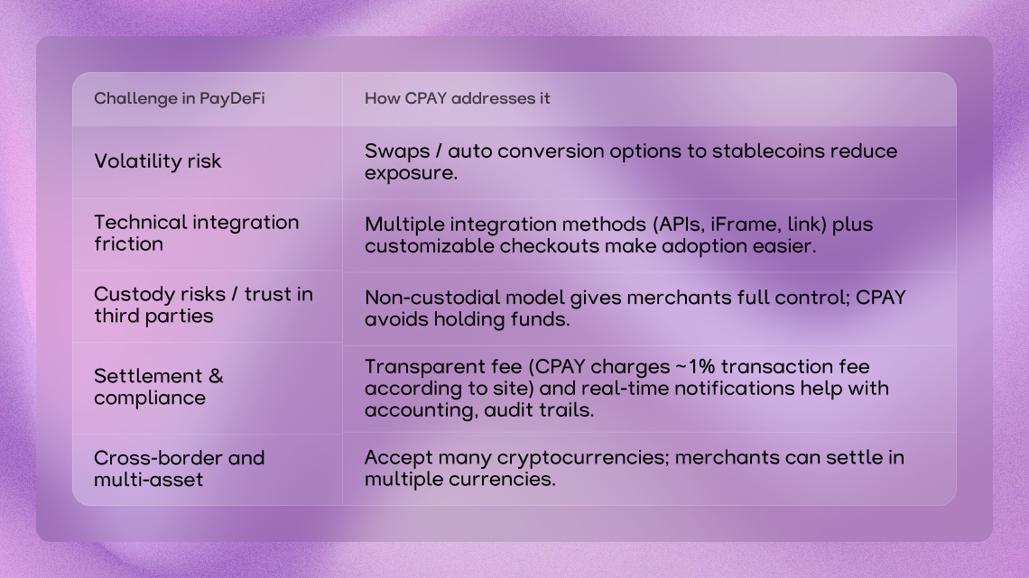 - Decentralized / non-custodial: CPAY never holds client funds - users interact with their own wallets.